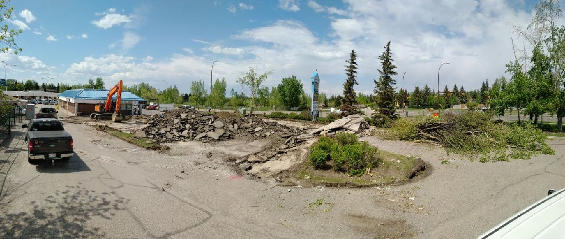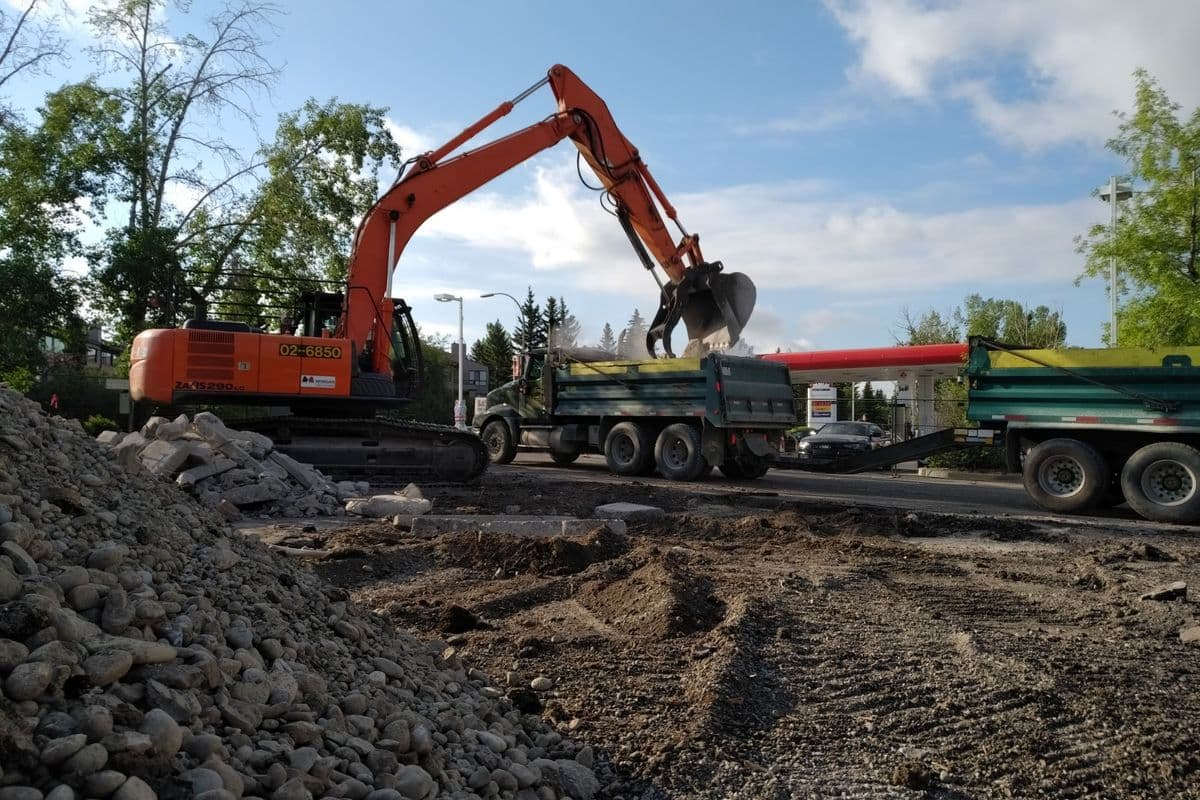Removed and disposed of asphalt, concrete, concrete curbs, and trees from the excavation site